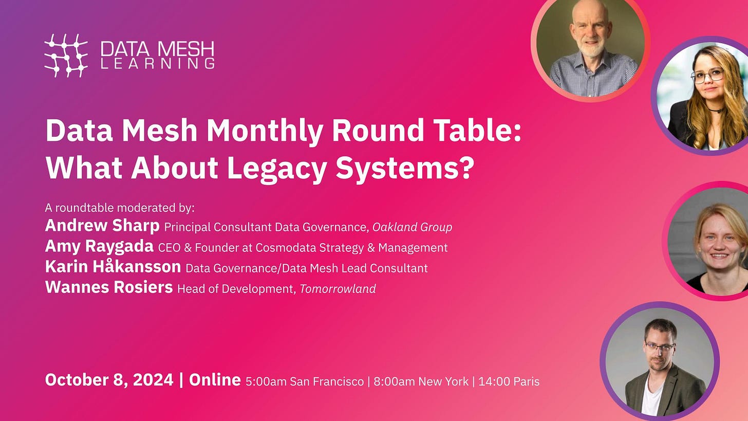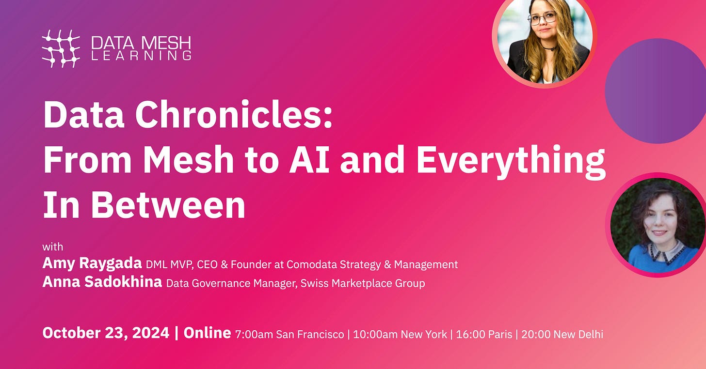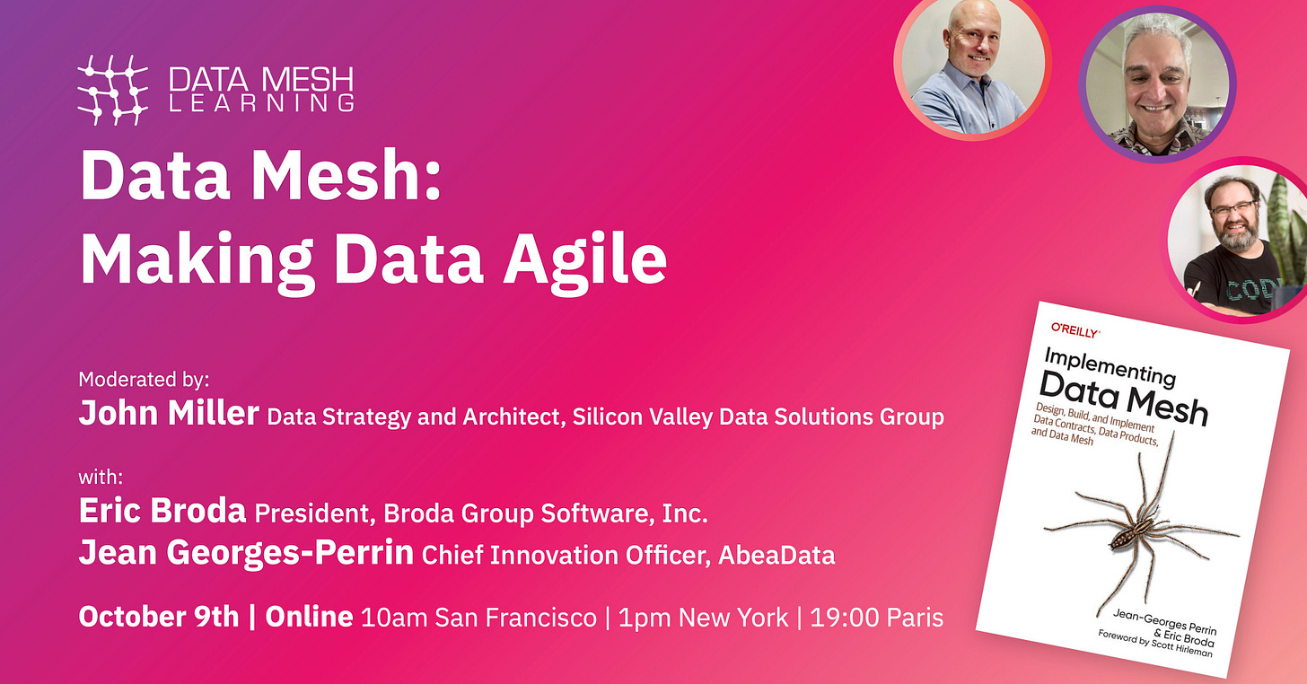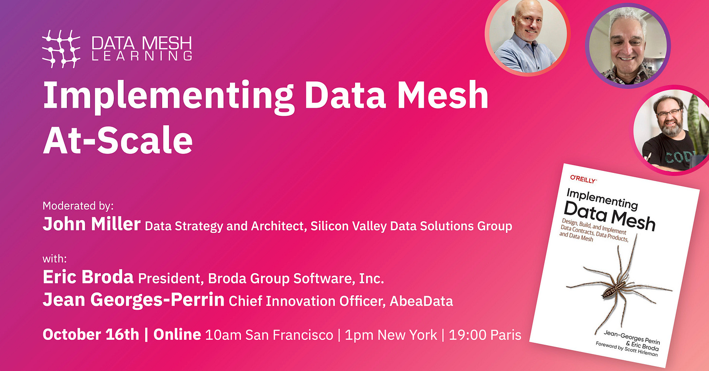 We’re excited to announce a new talk series with two of our DML MVPs, JGP and Eric Broda! We’ll be hosting roundtable discussions moderated by data strategist, John Miller, covering the topics in their recent book “Implementing Data Mesh” and giving away copies of their book. Join us in the coming weeks to deep dive with the authors on each of these important Data Mesh concepts. Join the Meetup group for more details.